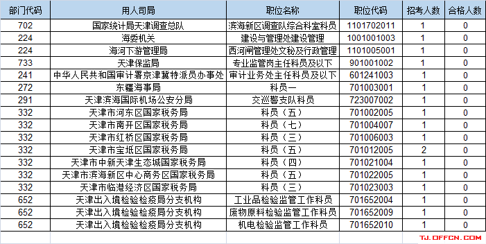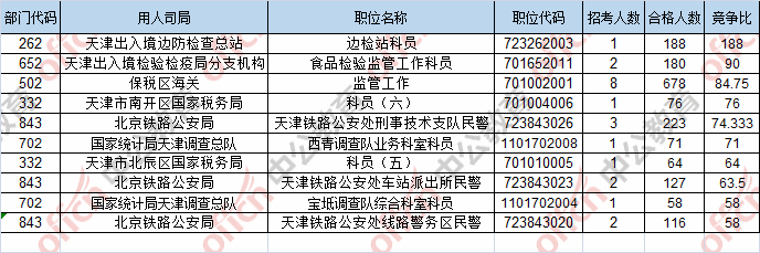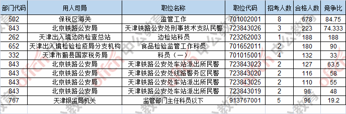 報(bào)名通過(guò)審核人數(shù)前十的職位主要集中在天津出入境邊防檢查總站、天津出入境檢驗(yàn)檢疫局分支機(jī)構(gòu)、保稅區(qū)海關(guān),具體信息如下: