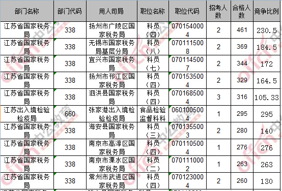 報名通過審核人數(shù)前十的職位主要集中在江蘇省國家稅務局、江蘇出入境檢驗檢疫局,具體信息如下: