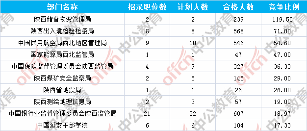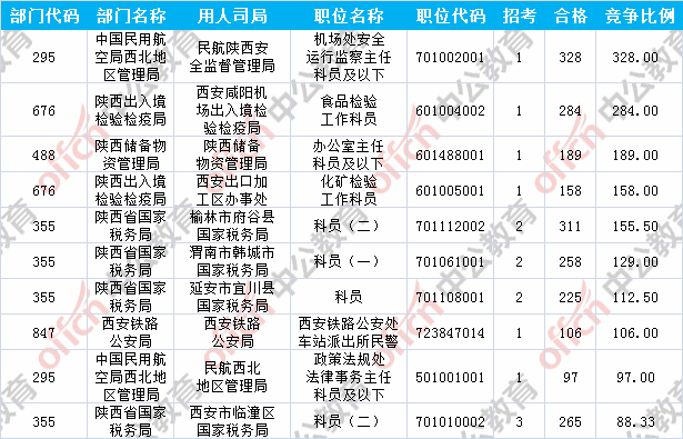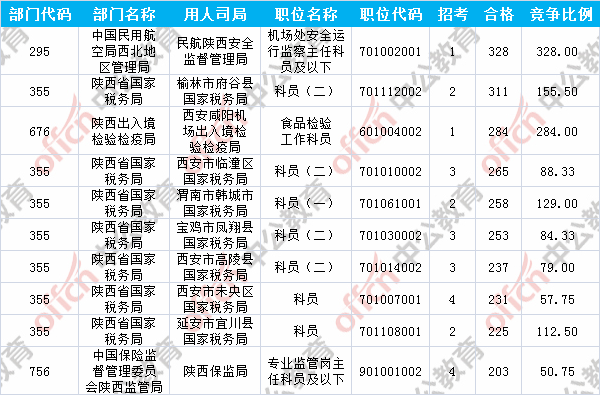 報(bào)名通過審核人數(shù)前十的職位主要集中在陜西出入境檢驗(yàn)檢疫局、陜西省國家稅務(wù)局、中國民用航空局西北地區(qū)管理局等部門,具體信息如下: