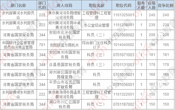 截止20日16時,招錄比例的職位為焦作黃河河務局博愛沁河河務局工程管理科一職,招錄1人,截止20日16時通過人數(shù)為240人。