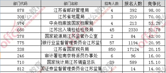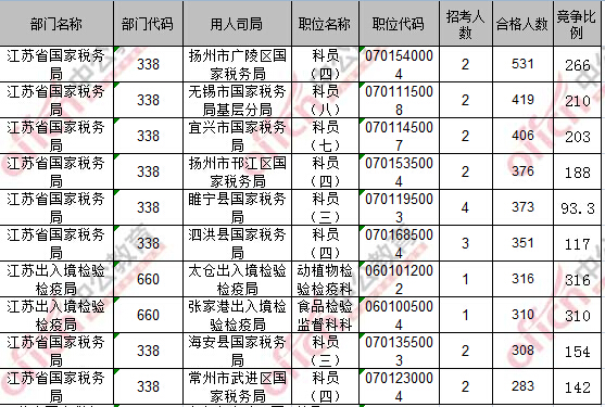 報名通過審核人數(shù)前十的職位主要集中在江蘇省國家稅務局、江蘇出入境檢驗檢疫局,具體信息如下: