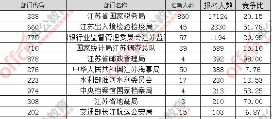 截至21日9時,據(jù)江蘇中公網(wǎng)校統(tǒng)計,2017國考招錄職位中工作地點在江蘇的職位通過審核總人數(shù)為23304人,共有16個職位無人通過審核,平均競爭比例為20:1。
