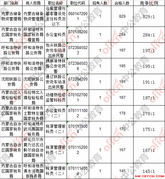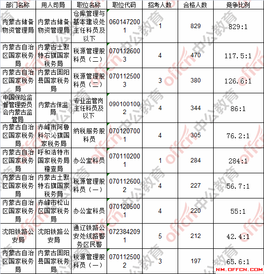 報(bào)名通過(guò)審核人數(shù)前十的職位主要集中在內(nèi)蒙古儲(chǔ)備物資管理局、內(nèi)蒙古固陽(yáng)縣國(guó)家稅務(wù)局、內(nèi)蒙古土默特右旗國(guó)家稅務(wù)局等部門(mén),具體信息如下: