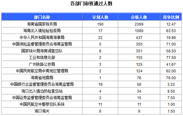 報名通過審核人數(shù)前十的職位主要集中在海南出入境檢驗(yàn)檢疫局、海南省國家稅務(wù)局、中華人民共和國海南海事局等部門,具體信息如下: