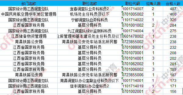 報名通過審核人數(shù)前十的職位主要集中在江西省國家稅務局、國家統(tǒng)計局江西調查總隊具體信息如下: