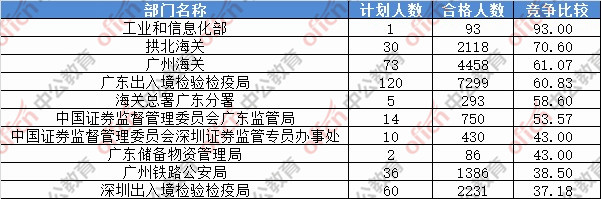 為幫助廣大考生更清晰的了解今日報(bào)名情況,廣東中公網(wǎng)校整理了審核通過人數(shù)前十位的部門以及競爭比例最激烈的十大部門,供廣大考生參考: