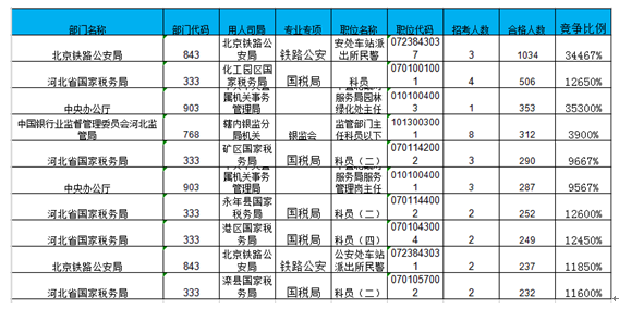 報名通過審核人數前十的職位主要集中在北京鐵路公安局、河北省國家稅務局、中央辦公廳等部門,具體信息如下: