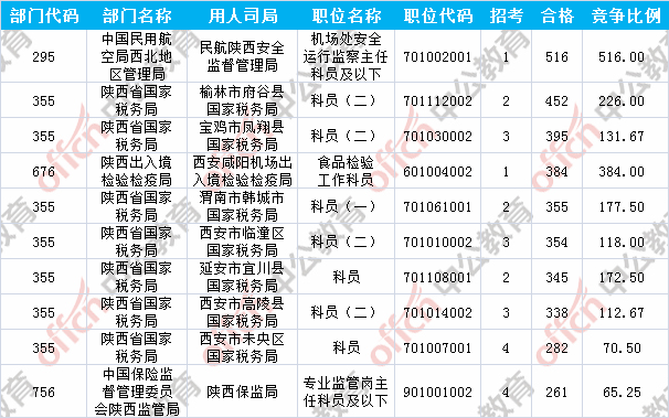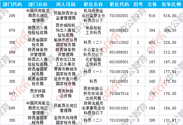 報(bào)名通過審核人數(shù)前十的職位主要集中在陜西出入境檢驗(yàn)檢疫局、陜西省國(guó)家稅務(wù)局、中國(guó)民用航空局西北地區(qū)管理局等部門,具體信息如下: