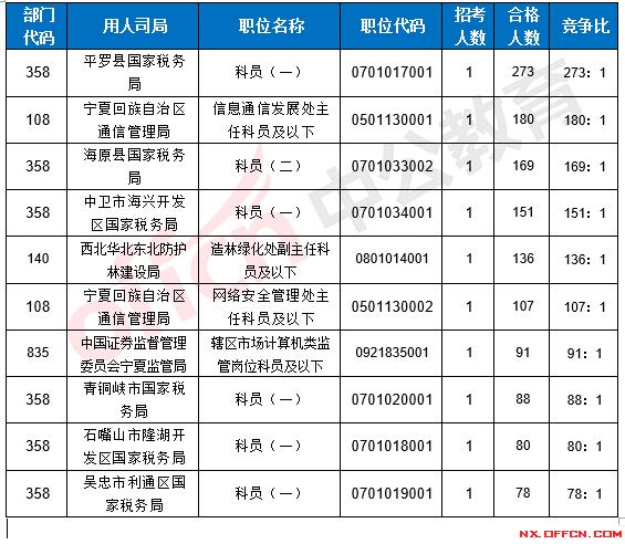 截止到22日8時,競爭比例的職位為平羅縣國家稅務(wù)局科員(一)一職,招錄1人,截止到22日8時合格人數(shù)為273人,具體信息如下: