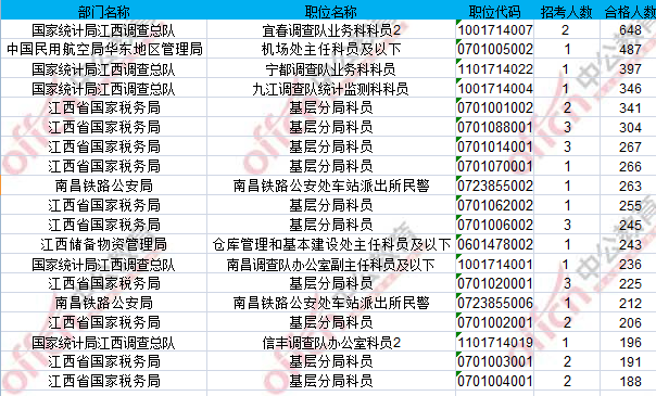 報名通過審核人數(shù)前十的職位主要集中在江西省國家稅務局、國家統(tǒng)計局江西調查總隊具體信息如下: