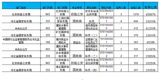 報(bào)名通過(guò)審核人數(shù)前十的職位主要集中在北京鐵路公安局、河北省國(guó)家稅務(wù)局、中央辦公廳等部門,具體信息如下: