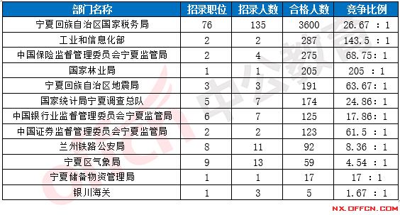 截止到22日16時,寧夏國考合格人數(shù)前三位的部門依次是:寧夏回族自治區(qū)國家稅務局、工業(yè)和信息化部、中國保險監(jiān)督管理委員會寧夏監(jiān)督局,三部門合格人數(shù)達4162人,占審核合格總人數(shù)的80.77%
