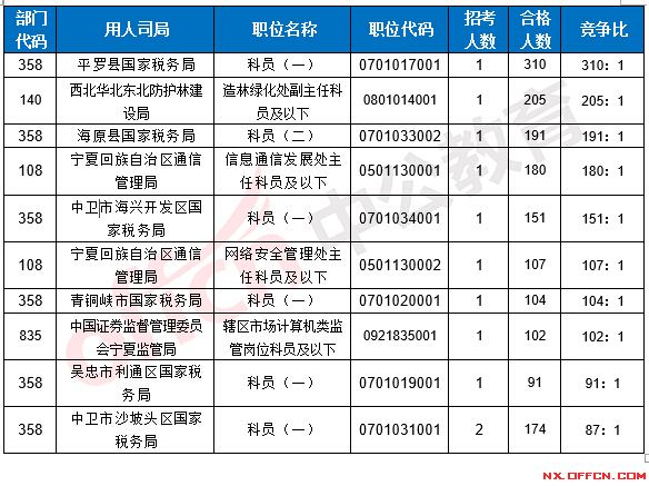 截止到22日16時,競爭比例的職位為平羅縣國家稅務局科員(一)一職,招錄1人,截止到22日16時合格人數(shù)為310人,具體信息如下: