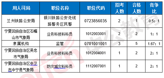 截止到22日16時,工作地點在寧夏的職位均有人報考,其中5職位競爭比低于面試比例。下面是爭比例低于面試比例職位一覽表,中公教育專家建議廣大考生多關注一些較冷職位,避免激烈競爭,結合自身條件,找到屬于自己的職位。