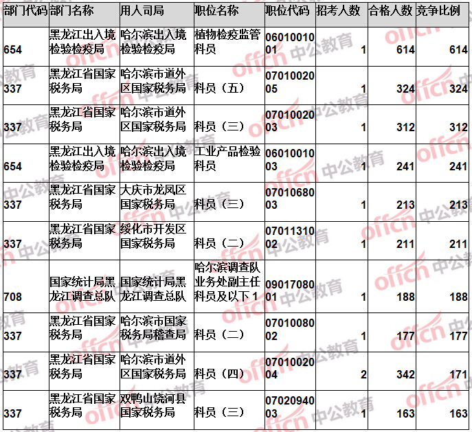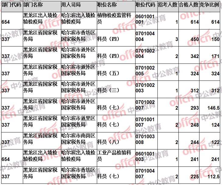 報名通過審核人數(shù)前十的職位主要集中在黑龍江省國家稅務局、黑龍江出入境檢驗檢疫局、哈爾濱鐵路公安局等部門,具體信息如下:
