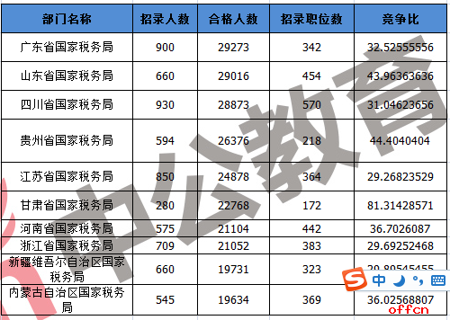 報(bào)名大戶——國稅系統(tǒng)今日?qǐng)?bào)名50萬大關(guān),共500737人通過審核,報(bào)名最多十大部門全部來自國稅系統(tǒng),共242705人通過審核,占總過審人數(shù)的29%。