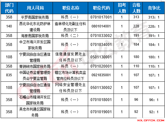 合格人數(shù)前十的職位主要集中在寧夏回族自治區(qū)國家稅務(wù)局、中國保險(xiǎn)監(jiān)督管理委員會(huì)寧夏監(jiān)管局、國家林業(yè)局等部門,具體信息如下: