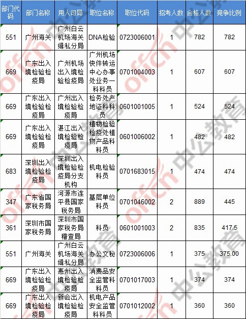 報(bào)名通過審核人數(shù)前十的職位主要集中在深圳海關(guān)、拱北海關(guān)、廣東省國家稅務(wù)局,具體信息如下: