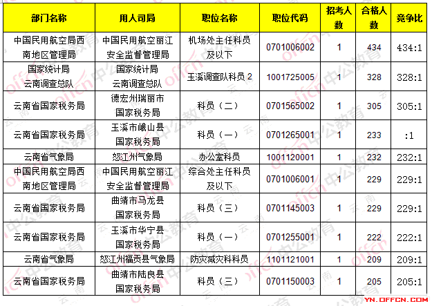 截止23日8時,招錄比例的職位為中國民用航空麗江安全監(jiān)督管理局_機場處主任科員及以下,職位代碼是0701006002,招錄1人,通過人數(shù)434人,競爭比434:1