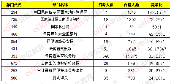 報名通過審核人數(shù)前十的職位主要集中在中國民用航空局西南地區(qū)管理局、云南省國家稅務(wù)局、云南省氣象局等,具體信息如下: