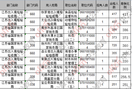 報(bào)名通過審核人數(shù)前十的職位主要集中在江蘇省國家稅務(wù)局、江蘇出入境檢驗(yàn)檢疫局,具體信息如下: