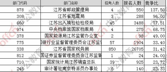 為幫助廣大考生更清晰的了解今日報(bào)名情況,江蘇中公網(wǎng)校整理了審核通過人數(shù)前十位的部門以及競爭比例最激烈的十大部門,供廣大考生參考: