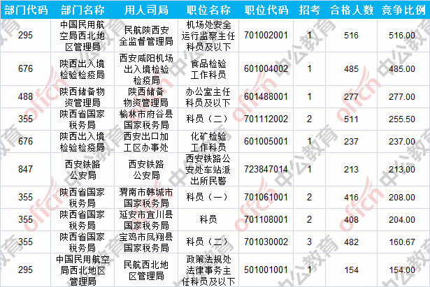 報名通過審核人數(shù)前十的職位主要集中在陜西出入境檢驗檢疫局、陜西省國家稅務(wù)局、中國民用航空局西北地區(qū)管理局等部門,具體信息如下: