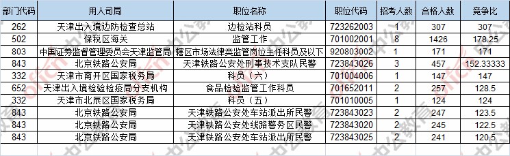 報名通過審核人數前十的職位主要集中在保稅區(qū)海關、北京鐵路公安局、天津出入境邊防檢查總站,具體信息如下:
