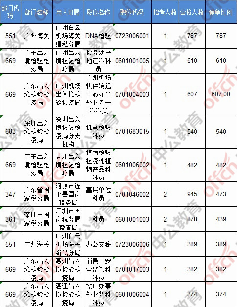 報(bào)名通過審核人數(shù)前十的職位主要集中在深圳海關(guān)、拱北海關(guān)、廣東省國家稅務(wù)局,具體信息如下: