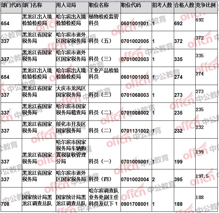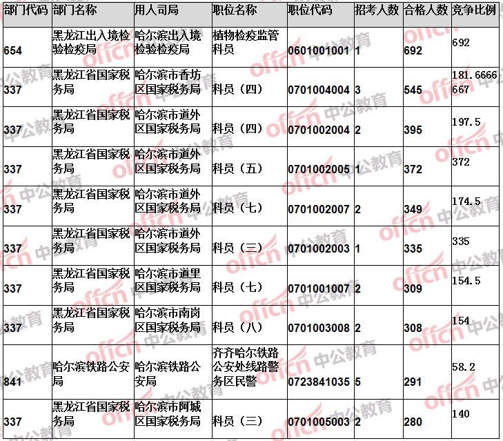 報(bào)名通過審核人數(shù)前十的職位主要集中在黑龍江省國家稅務(wù)局、黑龍江出入境檢驗(yàn)檢疫局、哈爾濱鐵路公安局等部門,具體信息如下: