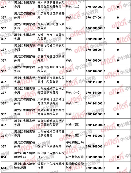 截止到23日16時(shí),工作地點(diǎn)在黑龍江的職位共有31個(gè)職位無人通過審核,占全部職位的5.4%。下面是無人報(bào)考職位一覽表,中公網(wǎng)校專家建議廣大考生多關(guān)注一些較冷職位,避免激烈競爭,結(jié)合自身?xiàng)l件,找到屬于自己的職位。