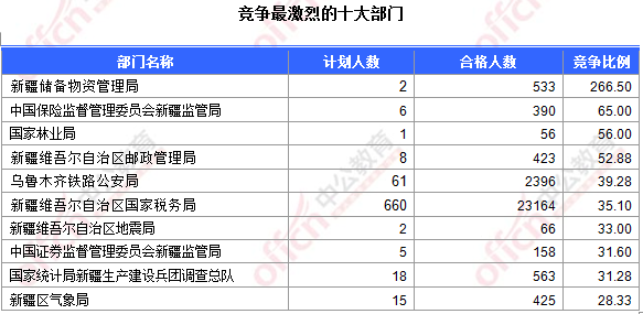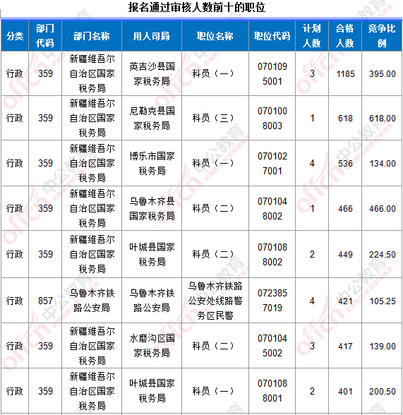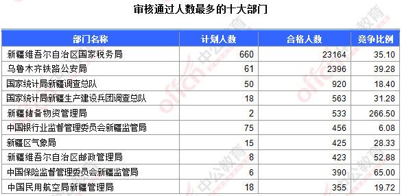 為幫助廣大考生更清晰的了解今日?qǐng)?bào)名情況,新疆中公網(wǎng)校整理了審核通過(guò)人數(shù)前十位的部門以及競(jìng)爭(zhēng)比例最激烈的十大部門,供廣大考生參考: