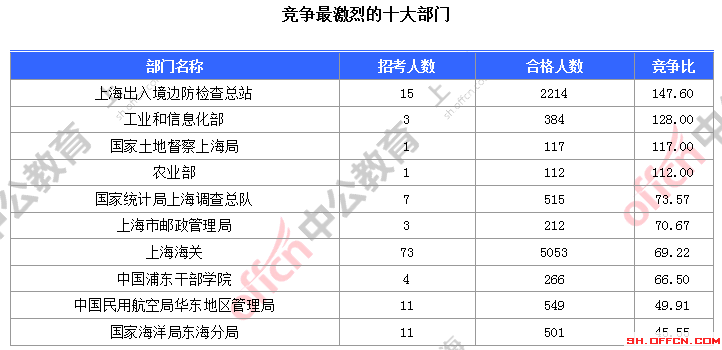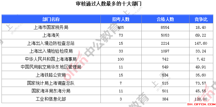 為幫助廣大考生更清晰的了解今日?qǐng)?bào)名情況,上海中公網(wǎng)校整理了審核通過(guò)人數(shù)前十位的部門以及競(jìng)爭(zhēng)比例最激烈的十大部門,供廣大考生參考: