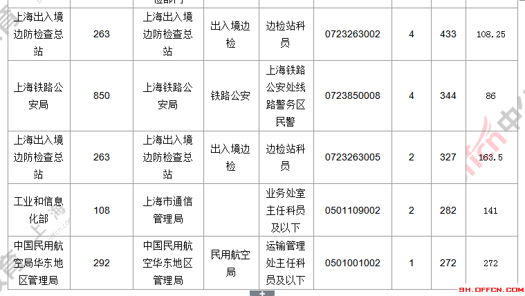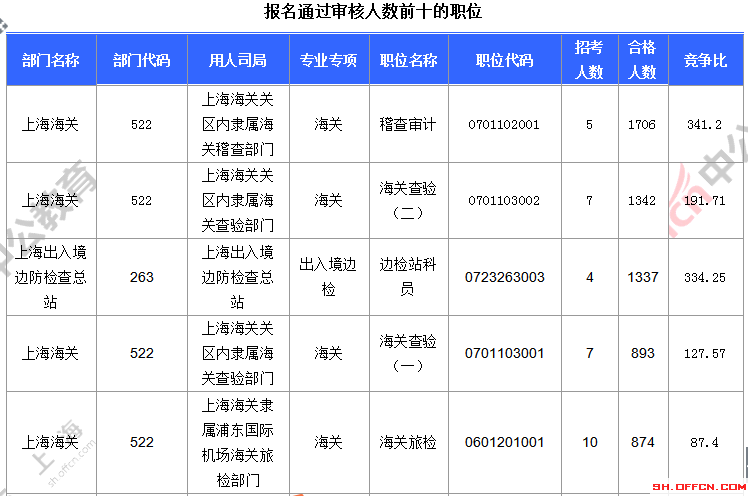 截止到23日16時(shí),上海海關(guān)稽查審計(jì)一職擊敗上海出入境邊防檢查總站邊檢站科員成為競(jìng)爭(zhēng)比例的職位,招錄5人,截止到23日16時(shí)通過(guò)人數(shù)為1706人。報(bào)名通過(guò)審核人數(shù)前十的職位主要集中在上海海關(guān)、上海出入境邊防檢查總站、上海鐵路公安局等部門,具體信息如下:
