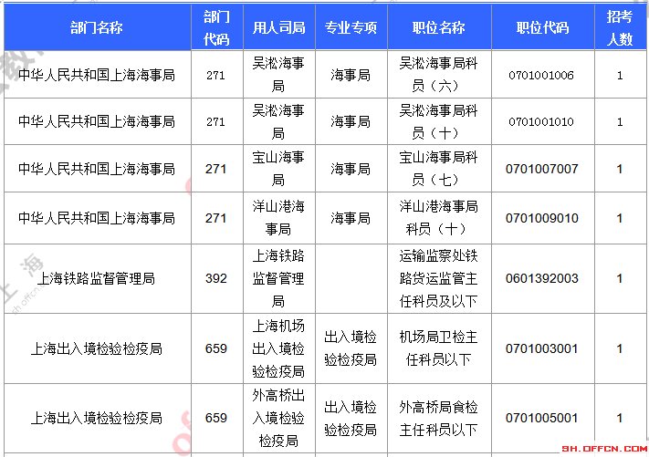 截止到23日16時(shí),工作地點(diǎn)在上海的職位共有9個(gè)無(wú)人報(bào)考,占全部職位的2.6%。下面是無(wú)人報(bào)考職位一覽表,上海中公網(wǎng)校專家建議廣大考生多關(guān)注一些較冷職位,避免激烈競(jìng)爭(zhēng),結(jié)合自身?xiàng)l件,找到屬于自己的職位。