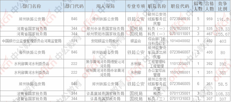 報名通過審核人數(shù)排名前列的職位主要集中在鄭州鐵路公安局、鄭州中牟縣國家稅務局,鄭州滎陽市國家稅務局,具體信息如下:
