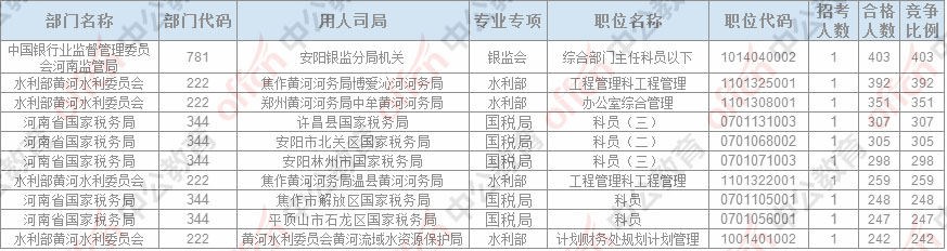 截止23日16時,招錄比例的職位為中公銀行業(yè)監(jiān)督管理委員會河南監(jiān)管局安陽銀監(jiān)分局機關(guān)綜合部門主任科員以下一職,招錄1人,截止23日16時通過人數(shù)為403人。