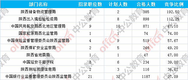 報名通過審核人數(shù)前十的職位主要集中在陜西省國家稅務(wù)局、中國民用航空局西北地區(qū)管理局、陜西出入境檢驗檢疫局等部門,具體信息如下: