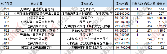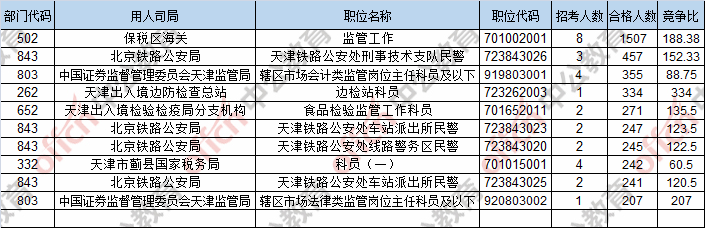 報名通過審核人數前十的職位主要集中在保稅區(qū)海關、北京鐵路公安局、中國證券監(jiān)督管理委員會天津監(jiān)管局,具體信息如下: