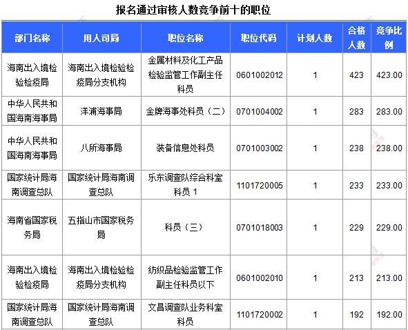 截止到24日8時(shí),仍有4個(gè)職位無人報(bào)名,而熱門職位競(jìng)爭卻是越來越激烈,其中報(bào)名人數(shù)最多的職位為:海南出入境檢驗(yàn)檢疫局,金屬材料及化工產(chǎn)品檢驗(yàn)監(jiān)管工作副主任科員,共報(bào)名423人,競(jìng)爭比例已高達(dá)423:1!