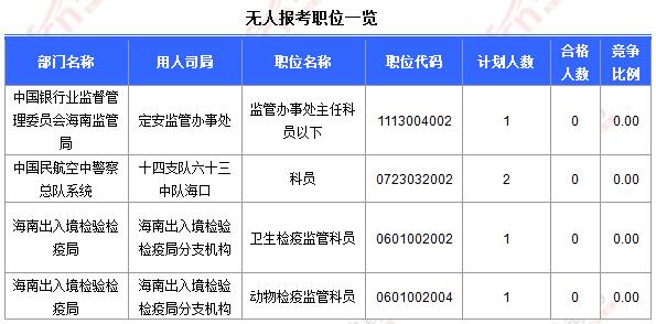 截止到24日8時(shí),工作地點(diǎn)在海南的職位共有4個(gè)無人報(bào)考。海南中公網(wǎng)校提醒廣大考生,報(bào)名最后一天,能選人少的盡量選擇!