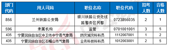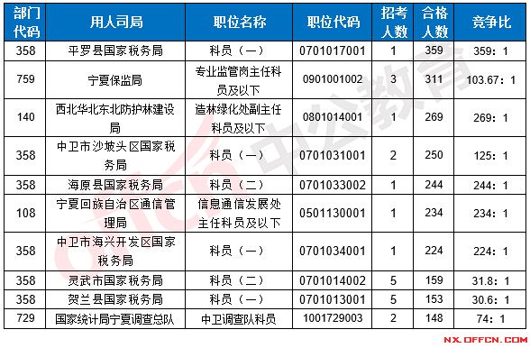 合格人數(shù)前十的職位主要集中在寧夏回族自治區(qū)國(guó)家稅務(wù)局、中國(guó)保險(xiǎn)監(jiān)督管理委員會(huì)寧夏監(jiān)管局、國(guó)家林業(yè)局等部門(mén),具體信息如下: