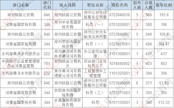 報名通過審核人數(shù)排名前列的職位主要集中在鄭州鐵路公安局、河南省國家稅務(wù)局,水利部黃河水利委員會,具體信息如下: