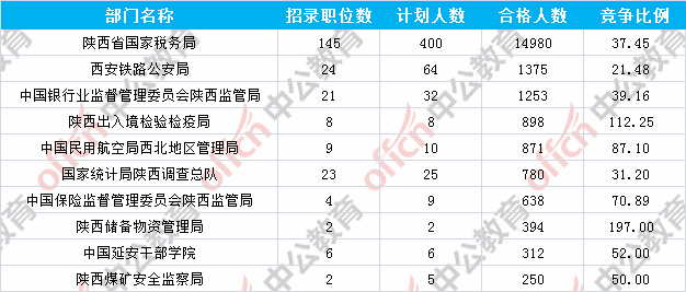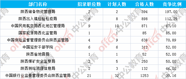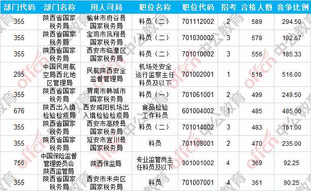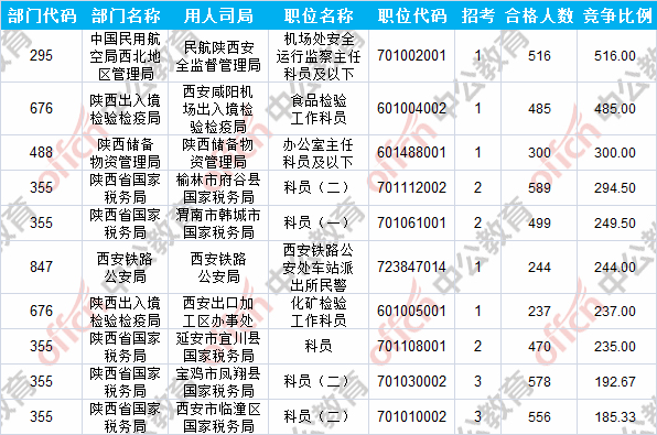 報名通過審核人數(shù)前十的職位主要集中在陜西出入境檢驗檢疫局、陜西省國家稅務(wù)局、中國民用航空局西北地區(qū)管理局等部門,具體信息如下: