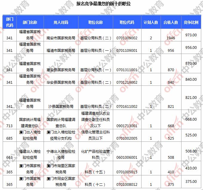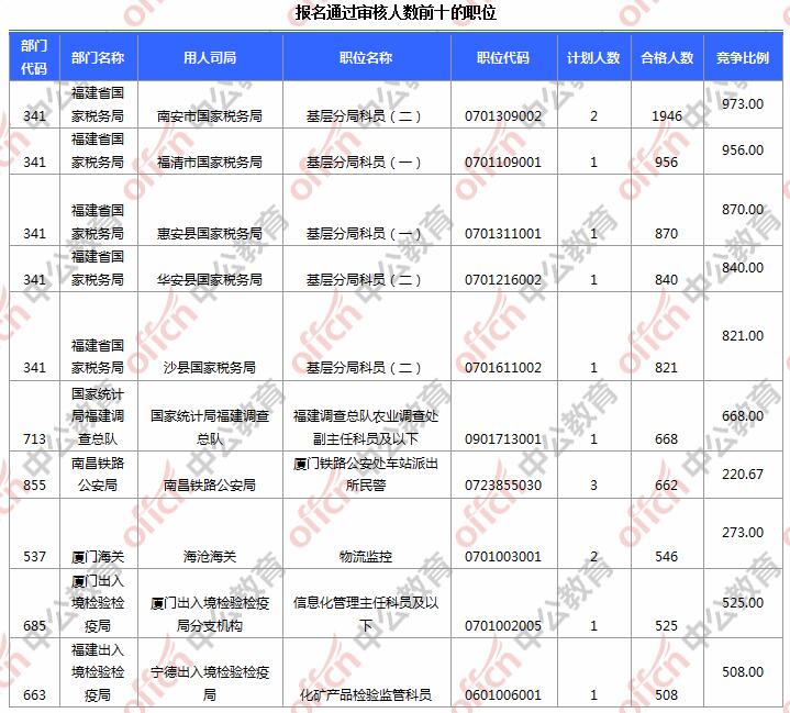 報(bào)名通過審核人數(shù)前十的職位主要集中在南安市國(guó)家稅務(wù)局、福清市國(guó)家稅務(wù)局、惠安縣國(guó)家稅務(wù)局等部門,具體信息如下: