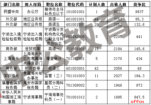 從中公網(wǎng)校統(tǒng)計數(shù)據(jù)來看,2017國考報名人數(shù)最多的職位仍然為民盟中央辦公廳接待處主任科員及以下(職位代碼為101001001),緊隨其后的是兩個外交部職位,分別為外交部地區(qū)業(yè)務(wù)司英語一(職位代碼為401001001)和外交部地區(qū)業(yè)務(wù)司英語五(職位代碼401001005),招錄職位44人、20人,合格人數(shù)3753、2652人,競爭比分別為85.3:1,132.6:1。