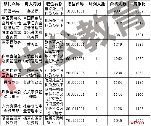 2017國家公務(wù)員考試報名階段已于24日18時落下帷幕,截止24日17時30分,共計1338698人通過審核,競爭比49.5:1,仍有223個職位無人報考。經(jīng)過10天的報名,民盟中央辦公廳接待處主任科員及以下(職位代碼為101001001),當仁不讓的成為了2017國考最難考的職位,競爭比高達9837:1,這一比例也超越了2013年度國考“國家統(tǒng)計局重慶調(diào)查總隊國家統(tǒng)計局重慶調(diào)查總隊國家統(tǒng)計局南川調(diào)查隊業(yè)務(wù)科室科員”職位保持4年的競爭比的記錄,9837:1這個“可怕”的數(shù)字也將載入國考歷史,該職位也成為史上國考最難考取職位,相信這一記錄在未來幾年很難被打破,同時也看到了國考作為大考的地位仍然牢不可破。