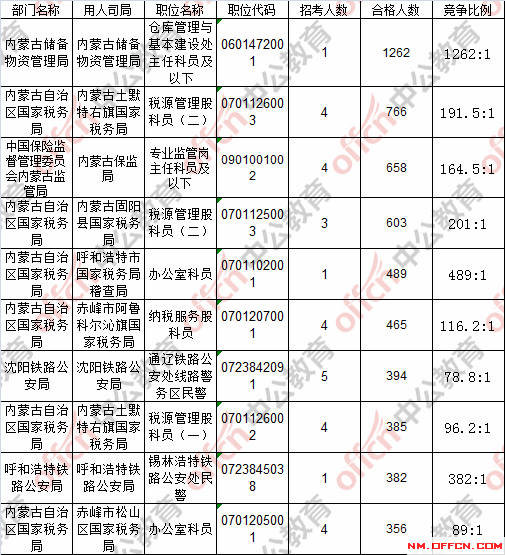 報(bào)名通過審核人數(shù)前十的職位主要集中在內(nèi)蒙古儲(chǔ)備物資管理局、內(nèi)蒙古土默特右旗國家稅務(wù)局、內(nèi)蒙古固陽縣國家稅務(wù)局等部門,具體信息如下: