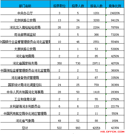 截止到24日17:30時(shí),通過審核人數(shù)前三位的部門依次是:河北省國家稅務(wù)局、北京鐵路公安局、中國銀行業(yè)監(jiān)督管理委員會河北監(jiān)管局,三部門通過審核總?cè)藬?shù)達(dá)35462人,占通過審核總?cè)藬?shù)的84%。
