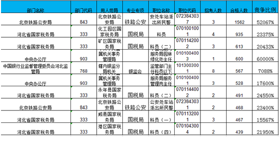 報(bào)名通過審核人數(shù)前十的職位主要集中在北京鐵路公安局、河北省國家稅務(wù)局、中央辦公廳等部門,具體信息如下: